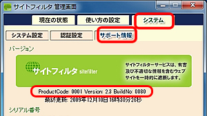 Windows7対応にて製品のバージョンは「InterSafe Personal Ver2.3」となり、本バージョンのリリースを持ちまして、旧バージョン(ver2.1、ver2.2)のサポートは、終息とさせて頂きます。バージョンは管理画面から「システム」タブをクリック後、表示される「サポート」タブをクリックすることでご確認いただけます。